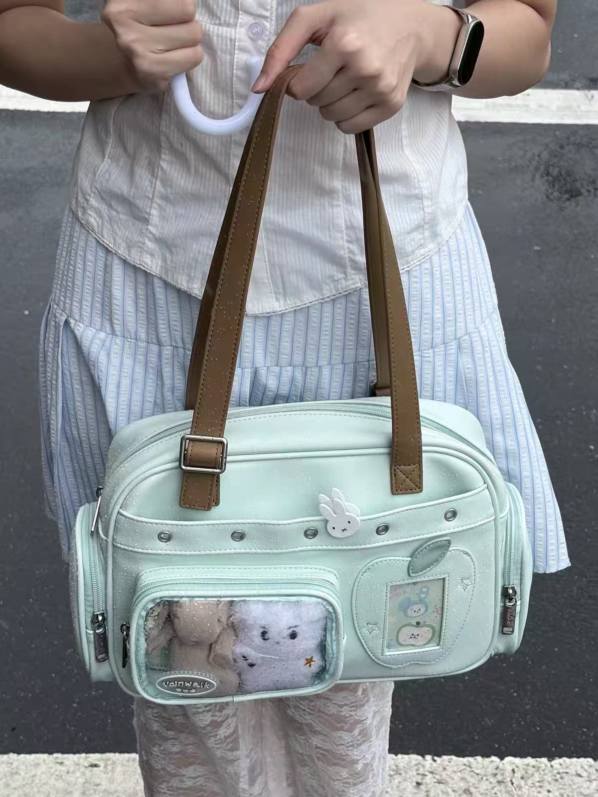 • هذه الحقيبة الكبيرة هي كل شيء—لطيفة وعملية للغاية! مزيج الوردي والأخضر يشبه انفجار قوس قزح، تمامًا أسلوبي لمواعيد الغداء الخفيفة. استمر الأصدقاء في السؤال من أين حصلت عليها! 😍
